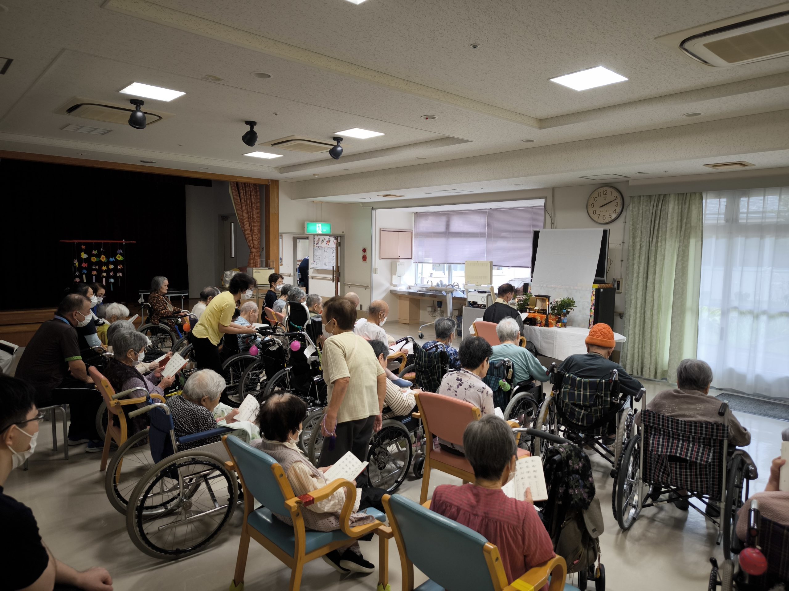 岡住職の「今日という日を生きていられるのは当たり前の事ではなく、さまざまな幸運の上に成り立っている有難い事なのです」というお話に、入居者の方々も深くうなずいておられました。また仏教婦人会の方には入居者様にとって旧知の方もおられ、「〇〇ちゃん、久しぶりじゃね」「元気にしちょった?これからも健康に気を付けてね」など会話が弾みました。